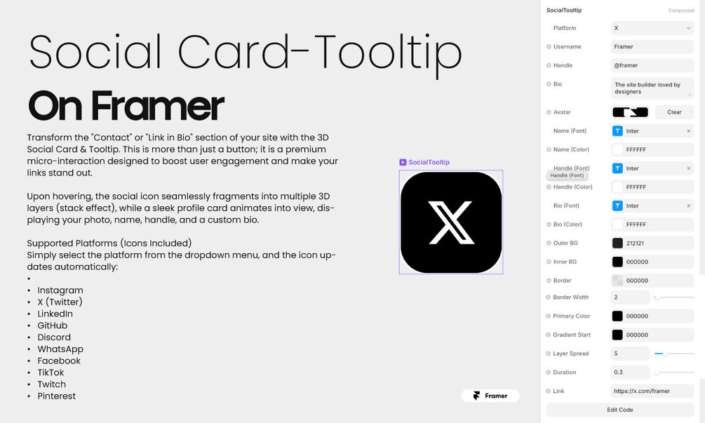 Transform the "Contact" or "Link in Bio" section of your site with the 3D Social Card & Tooltip. This is more than just a button; it is a premium micro-interaction designed to boost user engagement and make your links stand out.